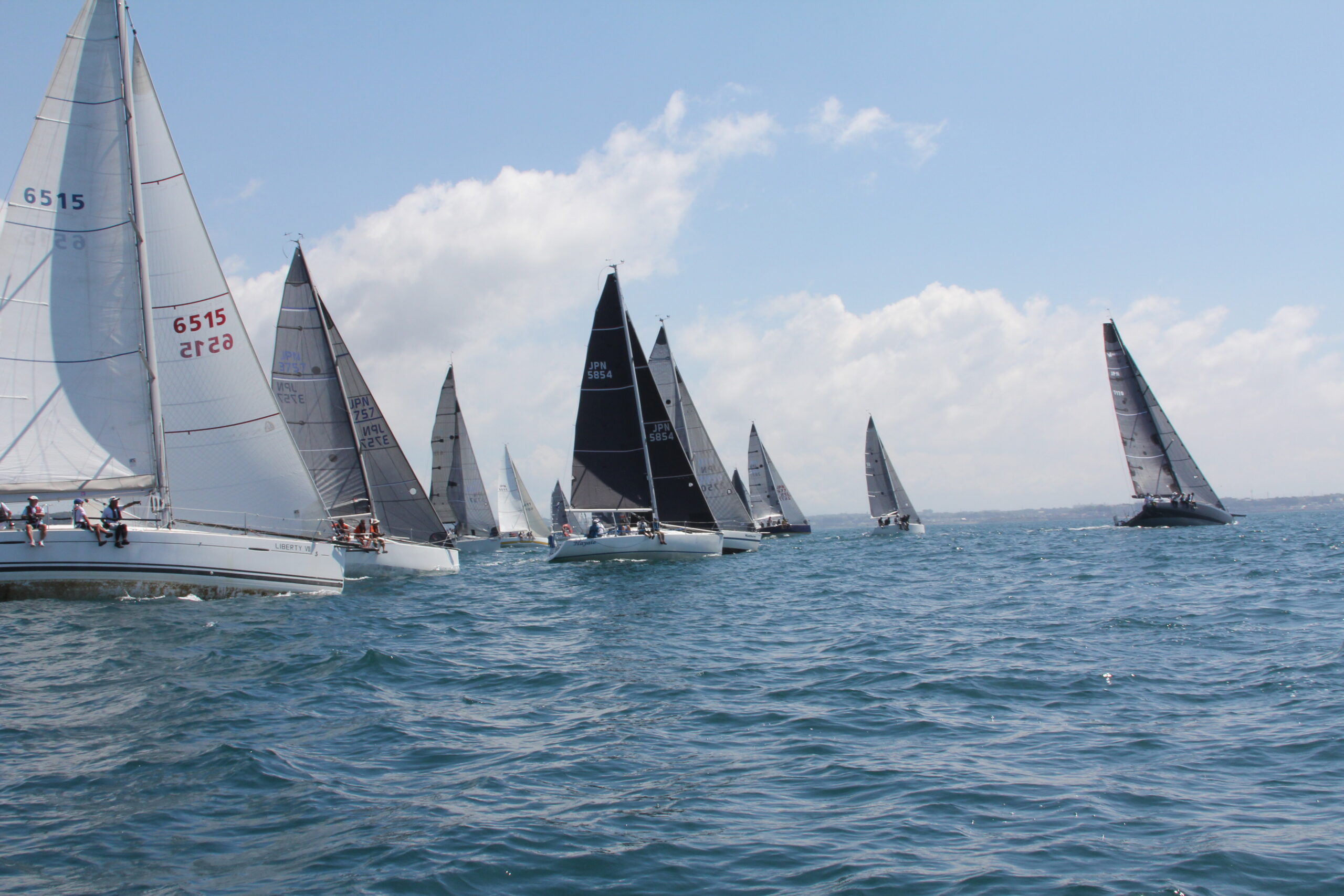前日には台風が通過するという状況の中、当日早朝まで北風が入った事も有り。海面は穏やか、風も予報より早く南風が入り始め最高のセーリング日和となりました。
